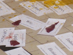 Nouvelles ratures, nouvelles précisions : un autre contenant est éventré d’un coup de couteau bien senti. Le liquide – du lait à saveur de framboise, blanc cette fois – se déverse sur la « toile » qu’est visuellement devenu le performeur. Ce dernier dispose sur une planche de bois des tranches de foie qu’il découpe en petits morceaux. Tout en continuant de monologuer sur l’outrancière expansion de l’idéologie capitaliste et de dialoguer avec le public (les mots « Quebec’s bridge » lui posent un problème de catégorisation. On lui explique le contexte de décrépitude du système routier québécois, on cause de l’effondrement des ponts et des viaducs, on rappelle la situation géographique de l’île de Montréal qui, au rythme où vont les choses, finira peut-être isolée du reste du monde… Et « Quebec’s bridge » va ainsi rejoindre les « voiture », « changements climatiques » et autres mots connotant les ravages de la société de consommation), Jörn place les morceaux de foie sur quelques termes choisis dont certains sont offerts à ceux qui les veulent.
