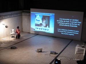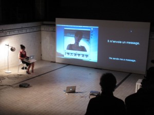 In one part of her performance she decides to launch iTunes and is listening to music at her laptop in her headphones. We are now watching her just “be at home” in front of us, the audience. Drinking wine. Eating fruit. Gazing at her computer. Marie-Suzanne diligently doing her dating research.