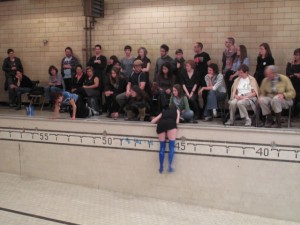 Voici une performance sur l’endurance mais une endurance souterraine / So what do you mean by that? / Je veux dire que c’est une performance qui ne peut pas avoir lieu s’il y a pas d’effort soutenu de la part de la performeuse et que si on sait qu’il y a un grande distance à parcourir, on ne sait pas si elle va réussir à faire complètement le tour / Climbs into the pool and balances on the edge with the weight of her torso then drags herself along until she reaches the pillar, gets out to get past pillar but then climbs back in / Souvent on emploie l’expression « garder le cap » / This action becomes more precarious as she slowly reaches the deep end / Dans ce cas-ci, je dirais se tenir sur la ligne de flottaison / – the height at which she is tenderly balanced becomes of greater concern / Je n’aurais pas aimé qu’elle se noie / Militaristic Marching Song / Je n’étais jamais certaine si l’énergie dégagée par le son des claquettes amplifié l’aidait ou la mettait dans une situation d’urgence encore plus grande parce que son temps était compté / J’ai quelques fois pensé aux manoeuvres de survie que les sauveteurs doivent pratiquer / If there would have actually been water in the pool it would have made her much lighter / So this line of blue that represents water becomes an additional weight for her to carry / L’action de prendre le temps de peinture